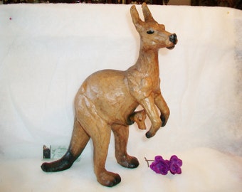 A wooden kangaroo sculpture with a textured surface is standing on a white surface. The kangaroo has a prominent tail, a pouch, and is holding a small purple flower in its front paws. The sculpture is positioned to the left of the image, and there is a small wooden kangaroo figurine to the right of the main sculpture. | Decorative Kangaroo and Joey Sculpture Figure Home Decor | a3ed9c9959c98f96064926a7ba3db9be80de674c5a1ee485f0e31a28269c6cad | 001229704253 | 0 | 0 | 58 | 8 | 0 | 0 | |