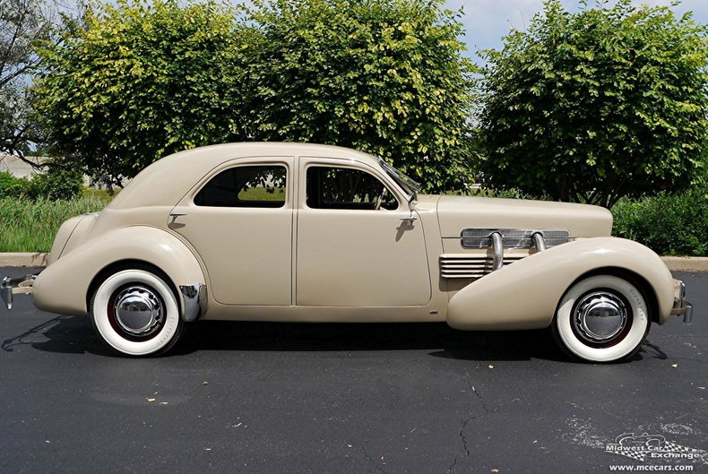 A vintage beige car with a classic design is parked on a paved surface. The car has a rounded body, a prominent front grille, and a spare tire mounted on the rear. It is surrounded by lush green trees, and the scene appears to be set during the daytime with clear skies. | 1937 Cord Beverly 812 SC | 4fb29216538edc462c256381815045f16bf3922af2195e5a3d12493ad4f8c0c8 | 001229704446 | 0 | 0 | 52 | 5 | 0 | 0 | |