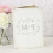 A white book with a decorative border and the initials 'M.T.' in the center is placed on a white surface. The book is closed, and there is a bouquet of white flowers in a clear vase to the left of the book. | Wedding Guest Book Bridal Shower Shabby Chic Decor | 0b67af18590adeea08836b8bbfa14363d975fb675d2e87fb348b53da67a4ba29 | 001229704234 | 0 | 0 | 42 | 8 | 0 | 0 | |