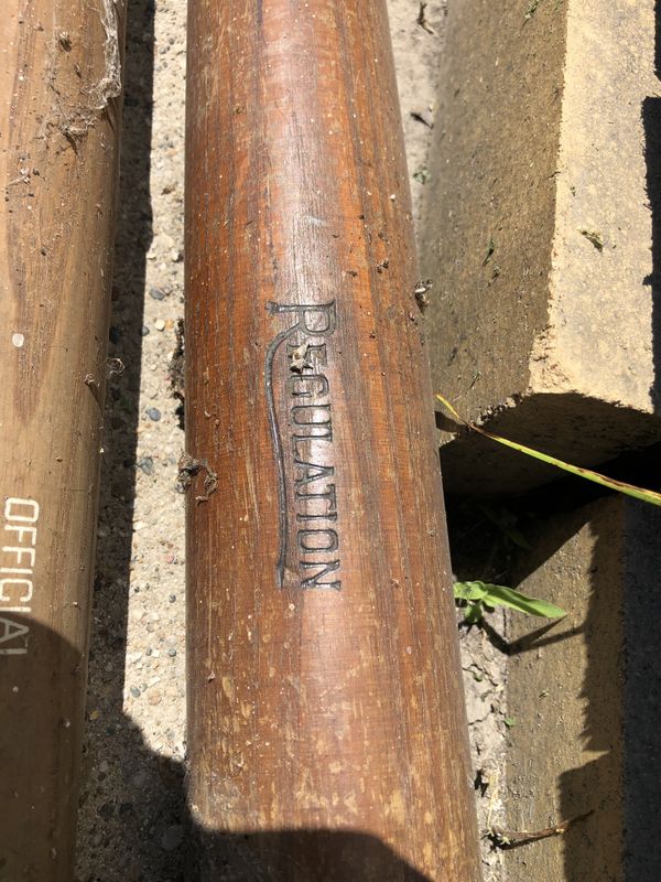 A wooden baseball bat with the word 'REGULATION' engraved on it lies on a concrete surface next to a brick wall. The bat has a dark brown color with some lighter brown areas and is positioned diagonally across the image. There is a shadow cast by the bat, indicating a light source from the upper left. | Vintage softball bats - selling all together | 8f325dd540d5bb0f9a8462aea068bcad8476caf44799c01838eba342734f5abf | 001229704497 | 0 | 0 | 56 | 7 | 0 | 0 | |