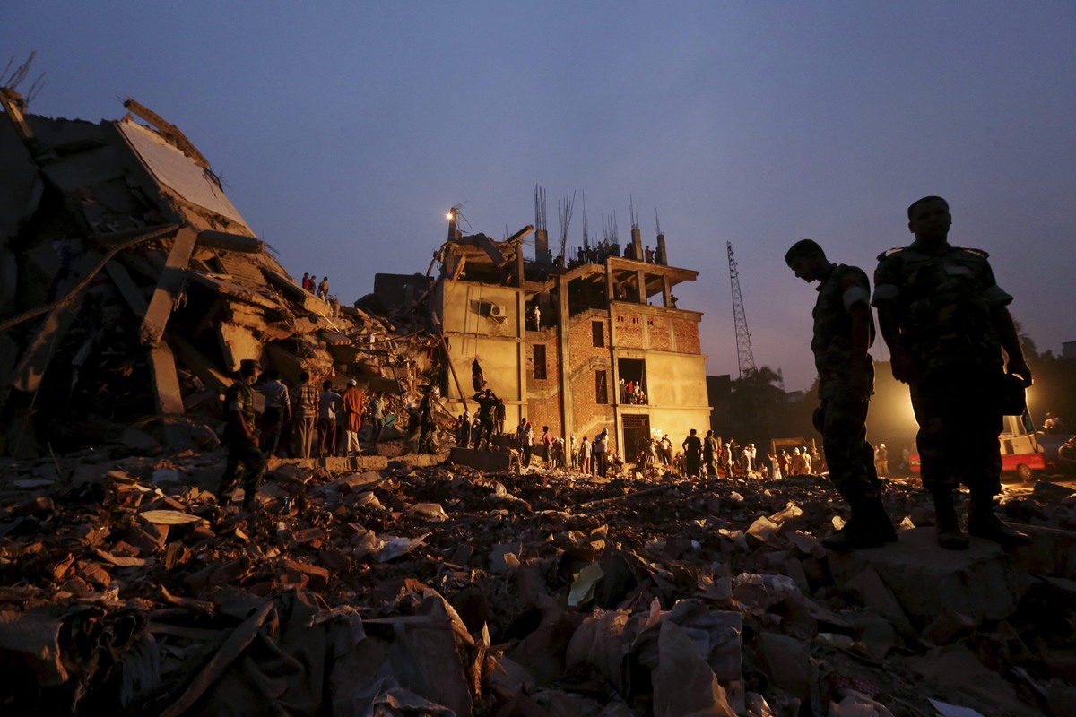 A group of people, including two men in military uniforms, are standing amidst a large pile of debris and rubble. The scene appears to be at night, with a dark sky above and a building in the background that is partially destroyed. There are several individuals scattered throughout the area, some closer to the foregrou... | At least <a href="http://www.huffingtonpost.com/2013/04/26/retailers-reject-bangladesh-factory-safety-plan_n_3162093.html" ta | a594cc4c4e532eb56b4789b706d6dbd7092fa1f712b01fdf2507de21597e163a | 001229704431 | 0 | 0 | 68 | 5 | 0 | 0 | |