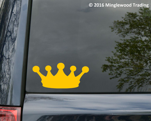 The first image shows the rear window of a car with a yellow sticker featuring a crown design. The sticker is centered on the window, and the car's tail lights are visible at the bottom left corner. The background is a blurred view of a cloudy sky and some green foliage. | CROWN Vinyl Decal Sticker 5" x 2.25" King Queen Princess Prince Tiara - V1 | 2736f57bd6aff6967c7cce6e0f520614d582c24773837f46e550f1fc088c18fa | 001229704945 | 0 | 0 | 51 | 14 | 0 | 0 | |