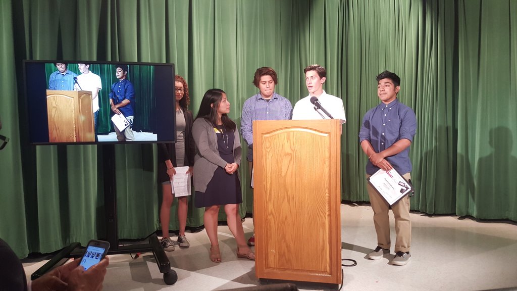 A group of five people is standing in front of a microphone on a stage. The person on the left is a woman wearing a gray cardigan over a black top and a blue skirt, holding a piece of paper. The next person is a man wearing a blue shirt and khaki pants, also holding a piece of paper. The third person is a man wearing a... | Thumbnail for T.C. Williams Seniors Honored by C-SPAN for Documentary Film on For-Profit Prisons | e4f5a852ccb45ea676edba182dfcac3e16eef95db876bfec788e70b1d0500a08 | 001229704931 | 0 | 0 | 112 | 14 | 0 | 0 | |