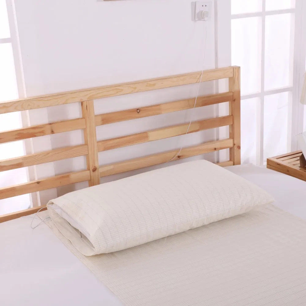 A wooden bed frame with a white knitted blanket and a white pillow on a white bedspread. The room has a white wall with a framed picture, a window with white curtains, and a bedside table with a lamp. | Grounded Conductive kits For Health & EMF Protection Earthing Pillow Case 50*75CM health grounded mat universal mat conductive kit grounding mats 68 25cm for emf protection | 4d45b53b5854a3010e3fba290e2656efb1e2bfc27226992da8d4f312097c261f | 001229705233 | 0 | 0 | 39 | 26 | 0 | 0 | |