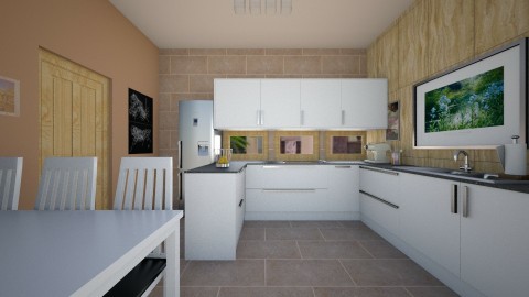 A modern kitchen with white cabinetry, a white refrigerator, and a white countertop. There is a white dining table with four chairs in the foreground. The walls are adorned with framed pictures, and the floor is tiled. | Dozsa - Minimal - Kitchen - by Ritus13 | 41147b2002abdd84b7a977faef4f6c6544103010391bb15be0c119db1820af24 | 001229705376 | 0 | 0 | 37 | 8 | 0 | 0 | |