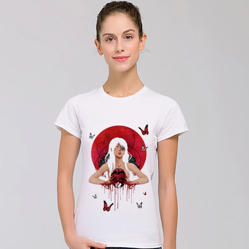 A woman is wearing a white t-shirt with a graphic design of a woman with white hair and red eyes, surrounded by butterflies and blood splatters, on a red background. | Bleeding Art Short Sleeve Tee | f1c138ed1f52e2d2952ee68b57ef34c0b36e88051ee7a9e211ba32fc60f9dbf5 | 001229705568 | 0 | 0 | 30 | 5 | 0 | 0 | |
