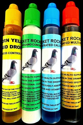 A row of colorful bottles with labels featuring a bird design and various health-related text. The bottles are arranged from left to right with the following colors: yellow, green, blue, red, and black. Each label has a different shade of the bird, and the text on the labels varies in color and content. | Racing Pigeons Birds Calcium D3 Oregano Multi Vitamins Yellow Drops Supplements. | a68864bf66dfa081b9bf7b0171fd2a16876f44c5091e4711885b0cd00b72bdd6 | 001229705691 | 0 | 0 | 53 | 11 | 0 | 0 | |
