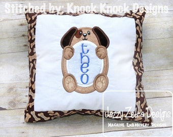 A plush toy with a white and brown spotted pattern, featuring a brown dog face with black eyes and a blue name tag with the name 'Theo' embroidered on it. The plush toy is placed on a wooden surface with a white background. | Dog Monogram Applique Design | 6a81cfcb2d1ff340c5019fd991067705bb475337e78cbabd17e6735431c99f03 | 001229705709 | 0 | 0 | 43 | 4 | 0 | 0 | |