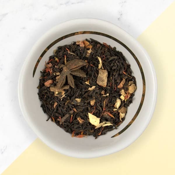 A bowl filled with loose tea leaves is placed on a marble surface with a yellow background. The tea leaves are a mix of black and brown, with some appearing to be dried flowers. The bowl has a smooth, curved shape and is positioned at an angle, revealing the contents. | Falliday Loose Leaf Tea | 0c82608cfef110892bafaba40ab20cbc5b0e0ed09622ec07e29c0ce16c3f9937 | 001229705616 | 0 | 0 | 50 | 4 | 0 | 0 | |