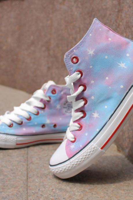 A pair of high-top sneakers with a unique, colorful design featuring a galaxy pattern on the upper part and a red sole. The sneakers are placed on a surface with a shadow cast to the right, indicating a light source from the left. | Pink Stars Pattern Tie Dye Hand Painted High Top Canvas Sneakers | 86f7be5ac4880695a94060722232aab65d0ad4960375c8bdeb4d6ac8bd13ed63 | 001229705795 | 0 | 0 | 43 | 11 | 0 | 0 | |