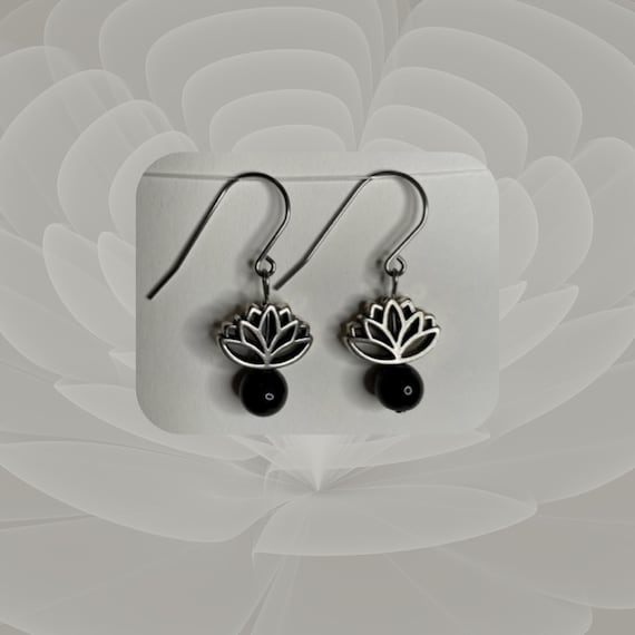 A pair of silver earrings with a black flower design and a black bead at the bottom is displayed against a white background with a circular pattern. | Black Onyx and Golden Lotus Earrings LOTUS VII | fbd39c08b7b4018bbd152d002994c2dc550931ba9237d1a5a10ece7f9eb64d5c | 001229705638 | 0 | 0 | 27 | 8 | 0 | 0 | |
