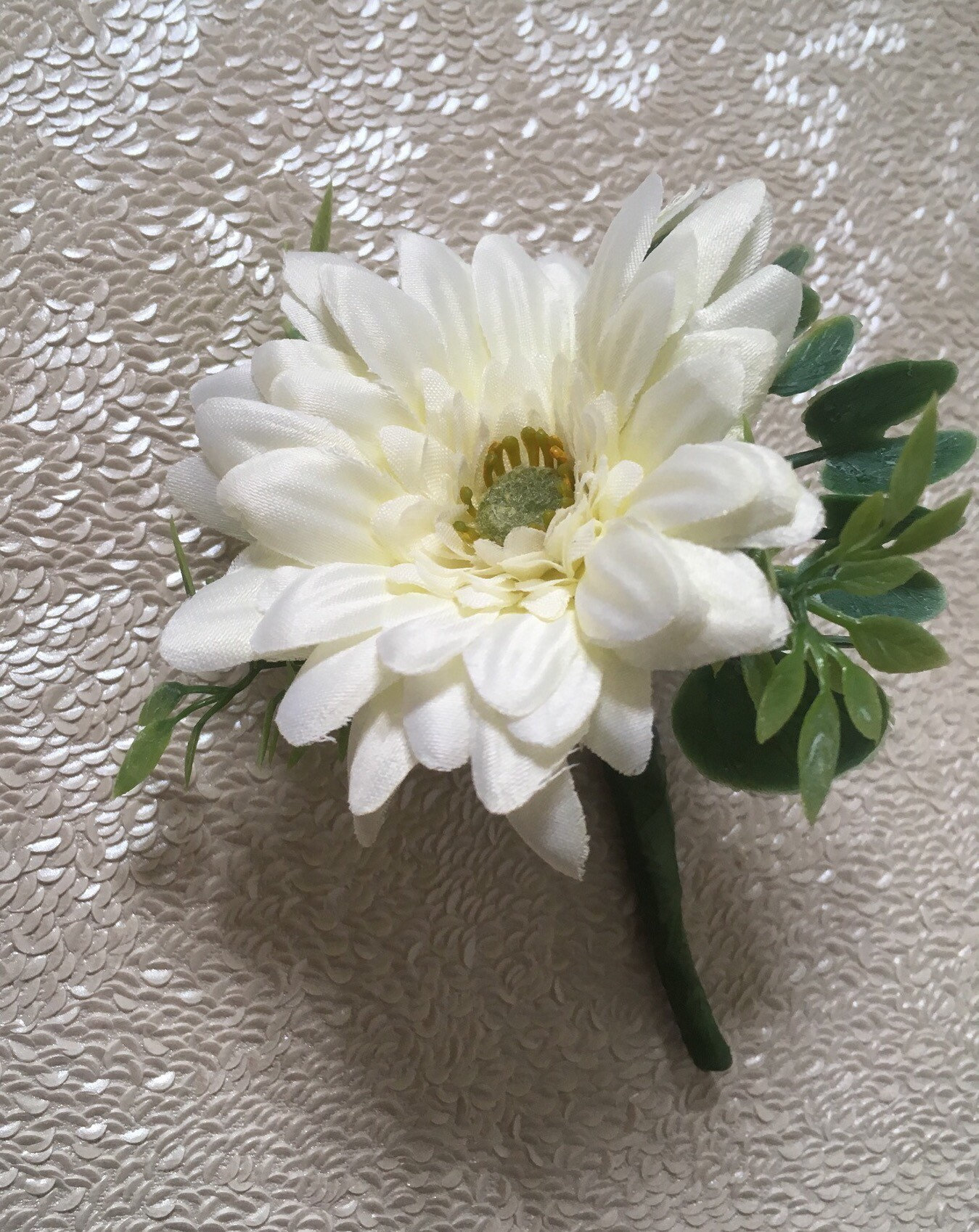A close-up image of a white daisy with a yellow center, surrounded by green leaves, attached to a green stem. The daisy is placed on a textured surface with a subtle pattern, and the background is a gradient of light to dark. | Bridal wedding bouquet flowers ivory & pink gerberas buttonholes corsage groom | 8d97fc24f3c76655fdd66ed550dd6370dc3ae9c66836b345af53b897ff7c655d | 001229705634 | 0 | 0 | 42 | 11 | 0 | 0 | |