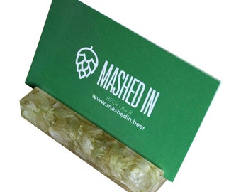 A green card with a white logo that reads 'MASHED IN' is displayed against a white background. The card is placed on a wooden surface with a textured green material underneath it. | Card Holder - Beer Hops | e212ff9c0b109852342789a50690a64f891f02d8f61851dd6a95df1a338c0d9f | 001229705398 | 0 | 0 | 32 | 5 | 0 | 0 | |