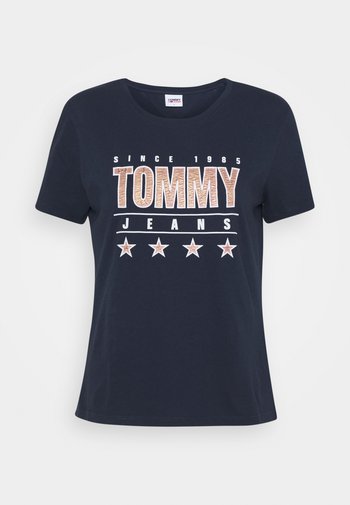 A navy blue t-shirt with a graphic design featuring the text 'Since 1993' and a star pattern above it, with the word 'Tommy' in a larger font below the stars. The t-shirt has a white tag on the back collar. | SLIM TEE - Print T-shirt - twilight navy | 4c3be55257db8bd485aab7bafd9dfdb2821bf88819a93e15eab176b980a5eb6d | 001229705742 | 0 | 0 | 40 | 8 | 0 | 0 | |