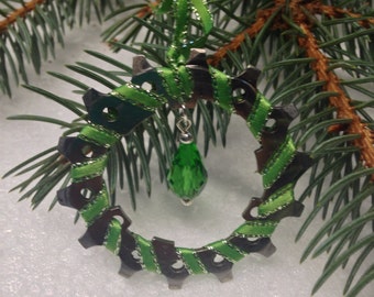 A close-up view of a green Christmas ornament with a metallic texture and a green gemstone hanging from it. The ornament is placed on a pine branch with snowflakes visible around it. | Recycled bike gear Christmas ornament | 866c2469cff57564a77189824222bd1e4eb5d5d5e1935cd03e84c798a0b5a1cb | 001229706053 | 0 | 0 | 32 | 5 | 0 | 0 | |