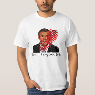 A man is wearing a white t-shirt with a cartoonish image of former US President George W. Bush with a red heart-shaped hole in his face. The text 'OPS! IT'S SORRY MR. BUSH' is written above the image. | BUSH SHOES, Oops !! Sorry Mr. Bush T-Shirt | 6dc6e97074b9639d9e94be85b5e8dde61915d5a4bd3c72eb72d662f89a3643a7 | 001229706047 | 0 | 0 | 38 | 8 | 0 | 0 | |