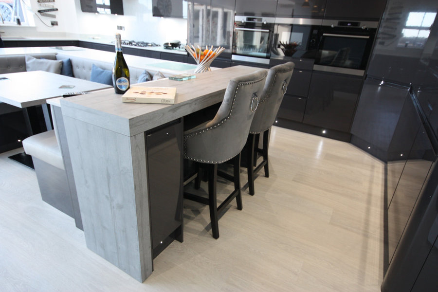 A modern kitchen with a central island featuring a wooden countertop and a set of four gray bar stools with tufted backs. The island has a built-in wine rack with a bottle of wine on top. There is a microwave and an oven built into the cabinetry. The floor is light-colored, and there is a book on the countertop. | Strada Grey Gloss Kitchen | f30ee2993e5be30d9829bfe1534f7584fb2eaffcf343d94961485a937ee240da | 001229706144 | 0 | 0 | 59 | 4 | 0 | 0 | |
