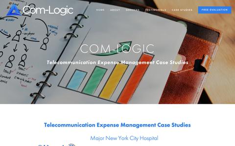 A leather-bound notebook is open on a wooden surface, displaying a graph with a green arrow pointing upwards. The notebook is titled 'COMMLOGIC' and has a tagline 'TELECOMMUNICATION EXPENSE MANAGEMENT CASE STUDIES'. Below the notebook, there is a website design with a blue and white color scheme, featuring the title 'C... | Screenshot of Case Studies Page com-logic.com - Case Studies \xe2\x80\x94 Com-Logic | Bringing IT and Finance Together | TEM | Telecom Expense Auditing and Management - captured Dec. 15, 2018 | 8a5c5b4b6947c1d30bb23c19b8169dcaef4a5e9062468db564c3ba78ae238771 | 001229706453 | 0 | 0 | 70 | 30 | 0 | 0 | |
