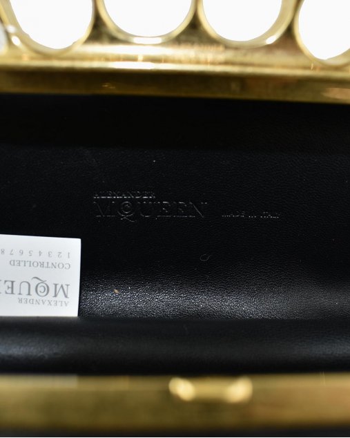 A black leather wallet with a gold clasp is placed inside a gold metal case. The wallet has a silver logo on the front and a white tag with the text 'MONOGRAM' and 'MONTGOMERY' on it. | Clutch Alexander Mcqueen Preta | 21e72c43a9696a0cbca565756db3b61583182cc2dc2de67a64df66747e16c589 | 001229706407 | 0 | 0 | 36 | 4 | 0 | 0 | |