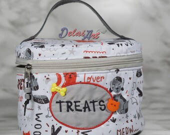 A white lunchbox with a cartoon character design and the words 'TREATS' in red and black lettering on the front. The lunchbox has a zipper closure and a small handle on top. The design includes various cartoon elements such as a cat, a dog, and a heart, along with other illustrations and text. | Dogs and Cats Treats bag, treats case, dog cookies suitcase, pet treat. | 0d8e50c90e80054ed96fa6d7eeb544434f149cbdd8b3968e5bc4a8a94aa696ed | 001229706464 | 0 | 0 | 53 | 12 | 0 | 0 | |