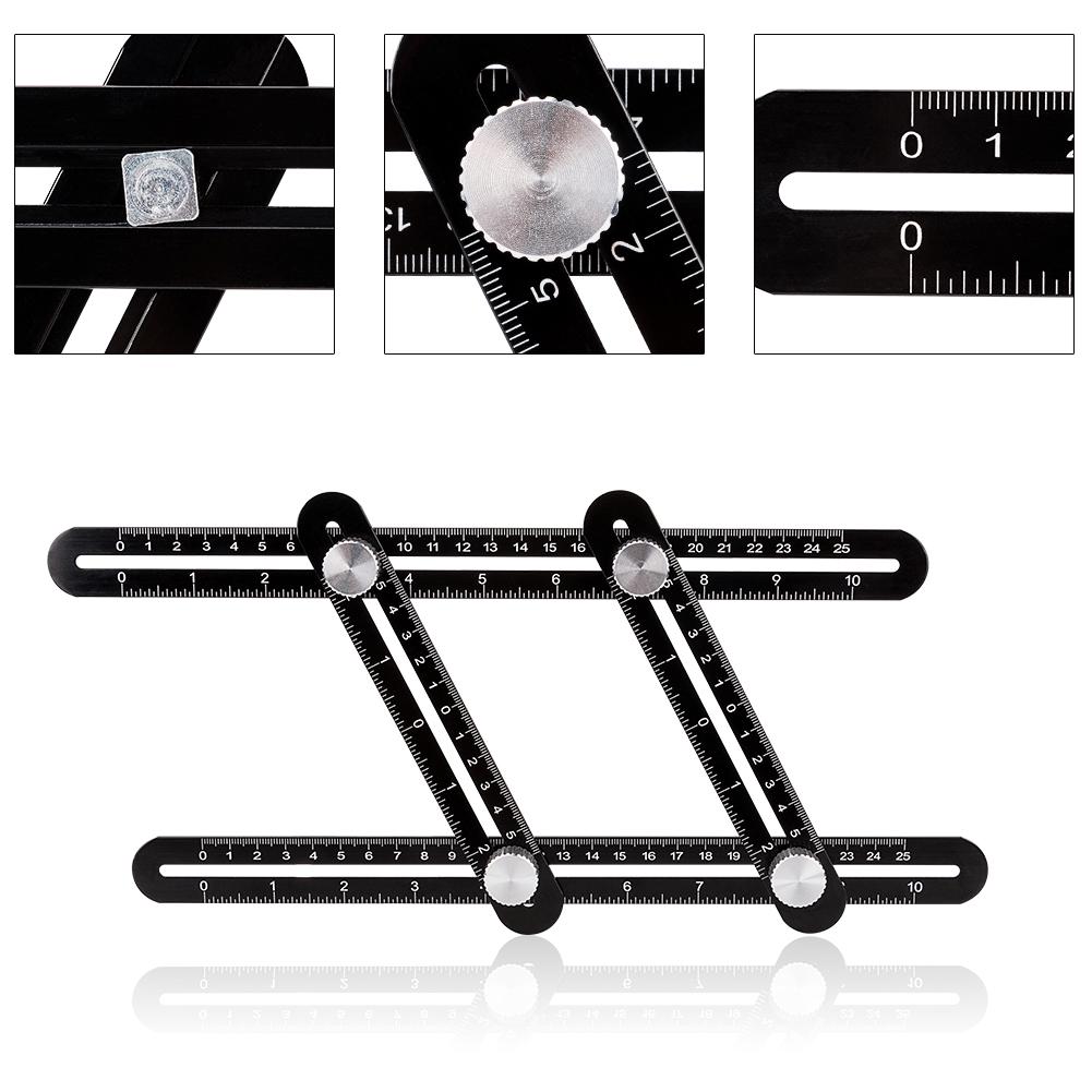 A black metal ruler with a silver metal edge and a black plastic handle is displayed against a white background. The ruler has a diamond-shaped hole at the top and is marked with measurements in centimeters and millimeters. There are also two small silver metal pieces attached to the ruler, one near the top and the oth... | Angle Finder Multi-Angle Measuring Ruler Measuring All Angles and Forms Green way Template Tool & Layout Tool A CUT ABOVE TOOL Angle Ruler | d944240f3f8da188fa1746e320ea651ac3ada6a1c34d76694eb516c1d0b8e228 | 001229706395 | 0 | 0 | 60 | 23 | 0 | 0 | |