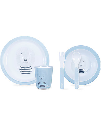 A set of blue children's plates with a cute animal design on them, accompanied by a blue cup and a fork. The plates are arranged in a way that suggests they are part of a complete set, with the largest plate in the center, flanked by two smaller plates, and the cup and fork placed to the right of the largest plate. | Jollein Dinner Set Wild Animals, Soft Blue - 100% Melamine! Meal Sets | 79aa03f1af9530389ab240a3a71d0e70820d10c6a16935bf2f9bb8c5b10b66e6 | 001229707187 | 0 | 0 | 62 | 12 | 0 | 0 | |