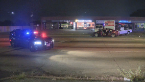 A police car is parked on the side of a street at night, with its lights on. There is a car accident scene in front of a store, with a car overturned and another car partially visible. The store has a lit sign that reads 'Cafe'. The scene is illuminated by the police car's lights and the store's sign. | Search continues for driver who fled following fatal crash in Arlington | 2e0caef9757c6f55d0a92bdbb62352cca69c0dfa8be22fb6517bf5f0b3a65efa | 001229707721 | 0 | 0 | 59 | 11 | 0 | 0 | |