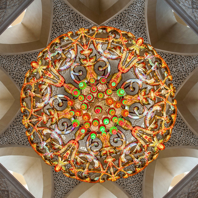 A close-up view of a large, ornate, multi-colored glass lampshade with intricate patterns and designs. The lampshade is set against a background with a patterned ceiling and a wall with a decorative arch. The lighting is focused on the lampshade, highlighting its vibrant colors and detailed craftsmanship. | "Grand Mosque Chandelier" stock image | 16d92bec4d13cae03b22a07c9af06112a97bae68e72e42ca8cfd89aeae6d9400 | 001229707590 | 0 | 0 | 47 | 5 | 0 | 0 | |