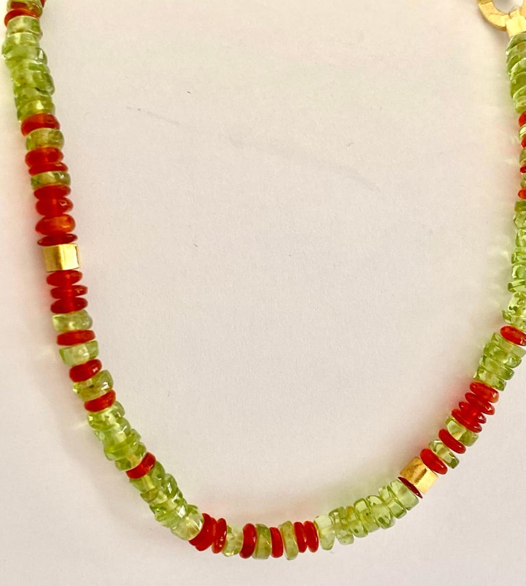 A close-up image of a green and red beaded necklace with a gold clasp. The beads are predominantly green with red accents, and the necklace is laid out on a white surface. | Modernist Yellow gold and Precious Stones Necklace, Handmade and Unique 'one of a kind' For Sale | 9c7c8ed23ccf3efb700b54c11bb14f98c9399669c277e7986283d314157df619 | 001229707749 | 0 | 0 | 32 | 16 | 0 | 0 | |