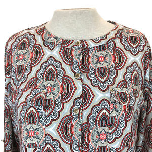 A mannequin displays a white shirt with a pattern of red and blue paisley designs. The shirt has a buttoned collar and a buttoned front with a few buttons undone. The sleeves are long and the shirt is worn over a white undershirt. | Dana Buchman Gray Red NWT Button Down Blouse L | 42077c1a17cd1f82b46374f216f2d7b358b3b09c08786e8266ec302fa222d20b | 001229707893 | 0 | 0 | 43 | 9 | 0 | 0 |