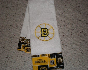 A white towel with a Boston Bruins logo in the center is draped over a surface. The towel has a pattern of yellow and black stripes at the bottom, and the Bruins logo is surrounded by the words 'Boston Bruins' in yellow. The surface appears to be a light-colored carpet. | Boston Bruins Hockey Terry Hand Towel | aad4ef76849f6d5c3e94b0a29eec3694fa3204e972b1b4266386a7df7bc8020a | 001229708183 | 0 | 0 | 50 | 6 | 0 | 0 | |