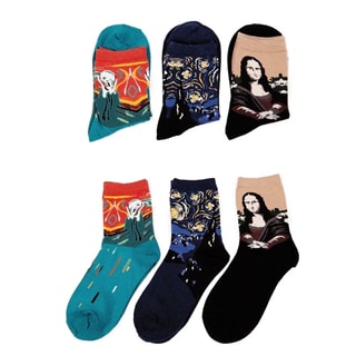 A set of five socks with various designs is displayed. The first sock from the left has a blue color with a red and yellow pattern featuring a ghost-like figure. The second sock is also blue with a similar pattern. The third sock is black with a blue pattern featuring a starry night sky and a figure resembling the Mona... | Modern Art Inspired Unisex Fashion Socks | b442db0eda5b5318c3923dcc63edc4aa4820b66f795278ce48bdd748b3d2f760 | 001229708865 | 0 | 0 | 103 | 6 | 0 | 0 | |