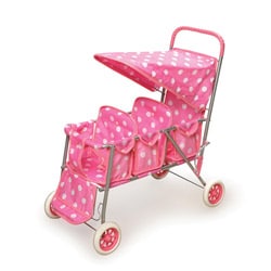 A pink baby stroller with a polka dot pattern on the canopy and seat, and a silver frame. The stroller has a single seat with a pink and white polka dot pattern, and a matching canopy that covers the seat. The wheels are pink with white polka dots and silver spokes. | Badger Basket Pink Polka Dots Triple Doll Stroller | cacced3dd0c5ffda84b268ccf6eba429686d0e0b706ca57ebfc4f8f42ed06a37 | 001229708901 | 0 | 0 | 51 | 8 | 0 | 0 | |
