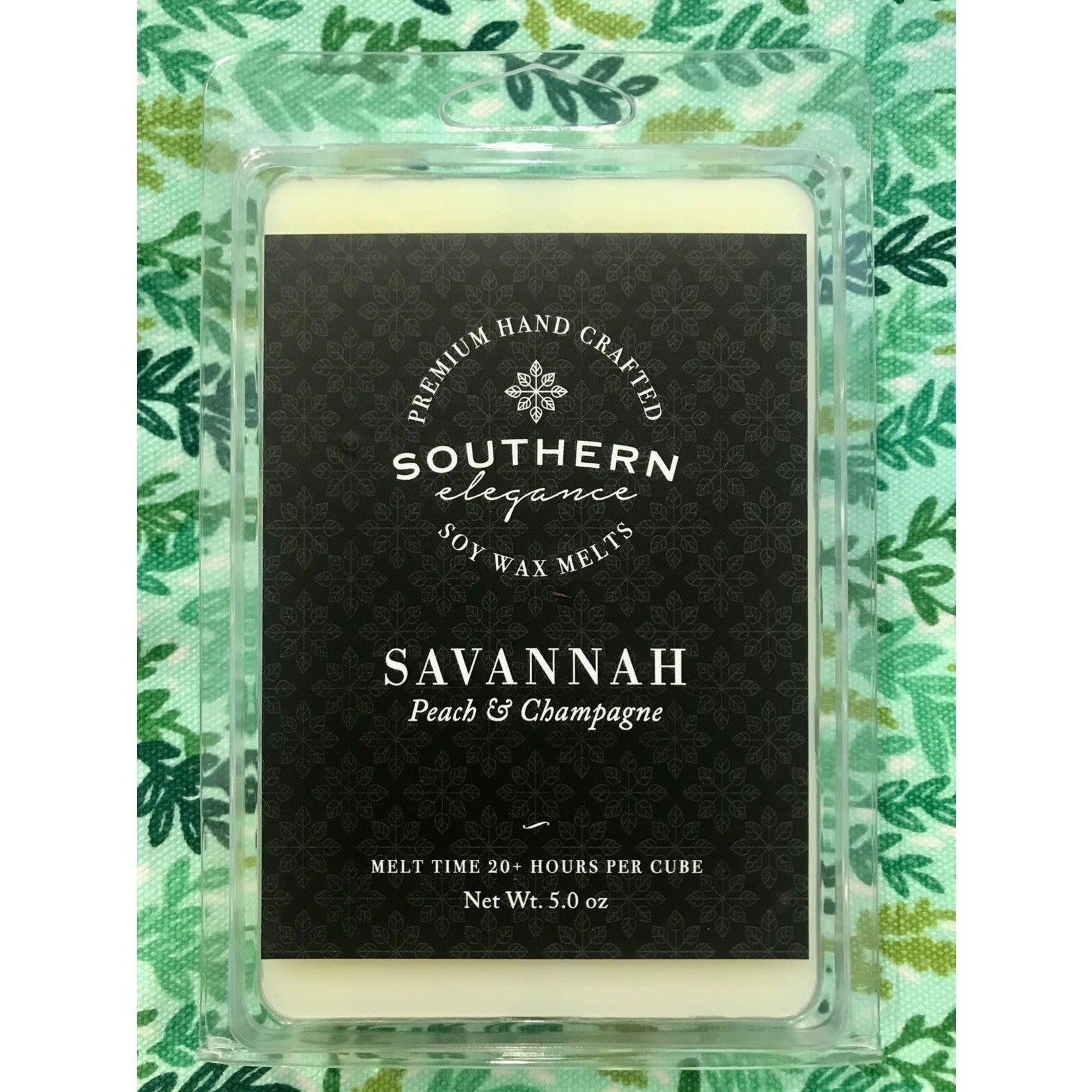 A square-shaped block of soap is wrapped in a clear plastic bag. The soap has a black label with white text that reads 'SOUTHERN LEGEND SOY WAX MELTS' and 'SAVANNAH PEACH CHAMPAGNE'. Below the text, there is a smaller text that says 'MELT TIME: 30-60 MINUTES NET WT. 3.0 OZ'. The soap is placed on a surface with a green... | Southern Elegance Candle Co. (BO) Jumbo Wax Melts | 1f7ad548b0e8f3749393fa972d43e4d82ffb5440d66255879608b04ebe0abd25 | 001229708890 | 0 | 0 | 64 | 8 | 0 | 0 | |