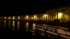 A serene nighttime scene of a river with a boat docked on the side. The buildings along the riverbank are illuminated by streetlights, casting a warm glow on the water. The sky is dark, indicating it is late evening or night. The boat is moored near the riverbank, and the water reflects the lights from the buildings an... | Moyka River at night, tourist boat sail along, old building facade, shaded bank Stock Footage | f21ceb6e5c5119151cdf9538efb63aad3d4a1c84345de5f415c29c5e3f04cf65 | 001229708921 | 0 | 0 | 65 | 15 | 0 | 0 | |