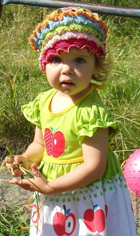 A toddler in a green dress with a yellow collar and a colorful knitted hat is holding a green leaf. | 79f1b605fec ... cotton for girl Bright colors. Hats and scarves handmade. Livemaster - handmade. Buy Summer knitted baby hat beret made ... | a951541c9772a81187404ea38626e0f6429d604d2b131f8d8f637402fde6f518 | 001229709074 | 0 | 0 | 20 | 22 | 0 | 0 | |