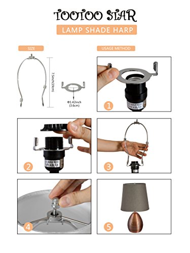 A step-by-step guide on how to assemble a lamp shade harp is presented. The guide includes illustrations of the harp, a lamp shade, and a person's hands holding the harp and shade. The steps are numbered and accompanied by text, providing instructions on how to attach the harp to the lamp shade. | 8'' TooToo Star Lamp Shade Harp Holder and E26 Light Base UNO Fitter Adapter Converter Finial Set,Tall 8inch I.D. 1-7/16''(36MM),Detachable Parts by TOOTOO STAR (Image #7) | 70f4e4dc167b5a111950239f74587f0a234c636c93d384f2a93438ee081dafcc | 001229709151 | 0 | 0 | 52 | 26 | 0 | 0 | |