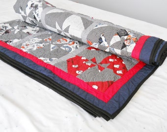 A quilt with a geometric pattern and a variety of colors, including red, blue, and gray, is folded on a bed. The quilt has a blue border with a red stripe and is placed on a white bedspread. | Star Wars Twin Quilt Bed Quilt Bedding Orange Blue Black Red Quilt Teen Quilt Child Quilt Rey Storm Trooper Darth Vader Battle Ships | 39ad7d6c3d3d0cc0bbcfa5715a41988c4eac5de234d965df1684e91eae08b096 | 001229709037 | 0 | 0 | 38 | 23 | 0 | 0 | |
