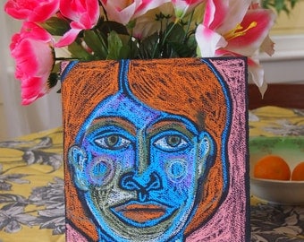A colorful drawing of a person's face with blue eyes and a pink background is placed on a dining table. The drawing is surrounded by a vase with pink and white flowers, and there are oranges in a bowl to the right of the drawing. | Strong Woman Oil Pastel Original drawing | f1424dafc5c825187e3e1bd07e15c3294b1e86c810c3f35611c73e44d65cc498 | 001229709120 | 0 | 0 | 45 | 6 | 0 | 0 | |