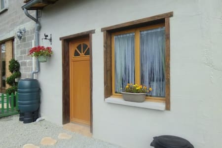 A quaint house with a wooden door and a window with sheer curtains. A potted plant with yellow flowers sits on the windowsill, and a hanging flower pot with red flowers is attached to the wall above the door. A green barrel is placed to the left of the door, and a trash can is visible in the foreground. | peartree cottage - Saint-Bonnet-de-Bellac | ff4f2c7291f25b19180715d916d288e58c3ffe35ff0ae9bf0642860dce8de41d | 001229710013 | 0 | 0 | 59 | 4 | 0 | 0 | |