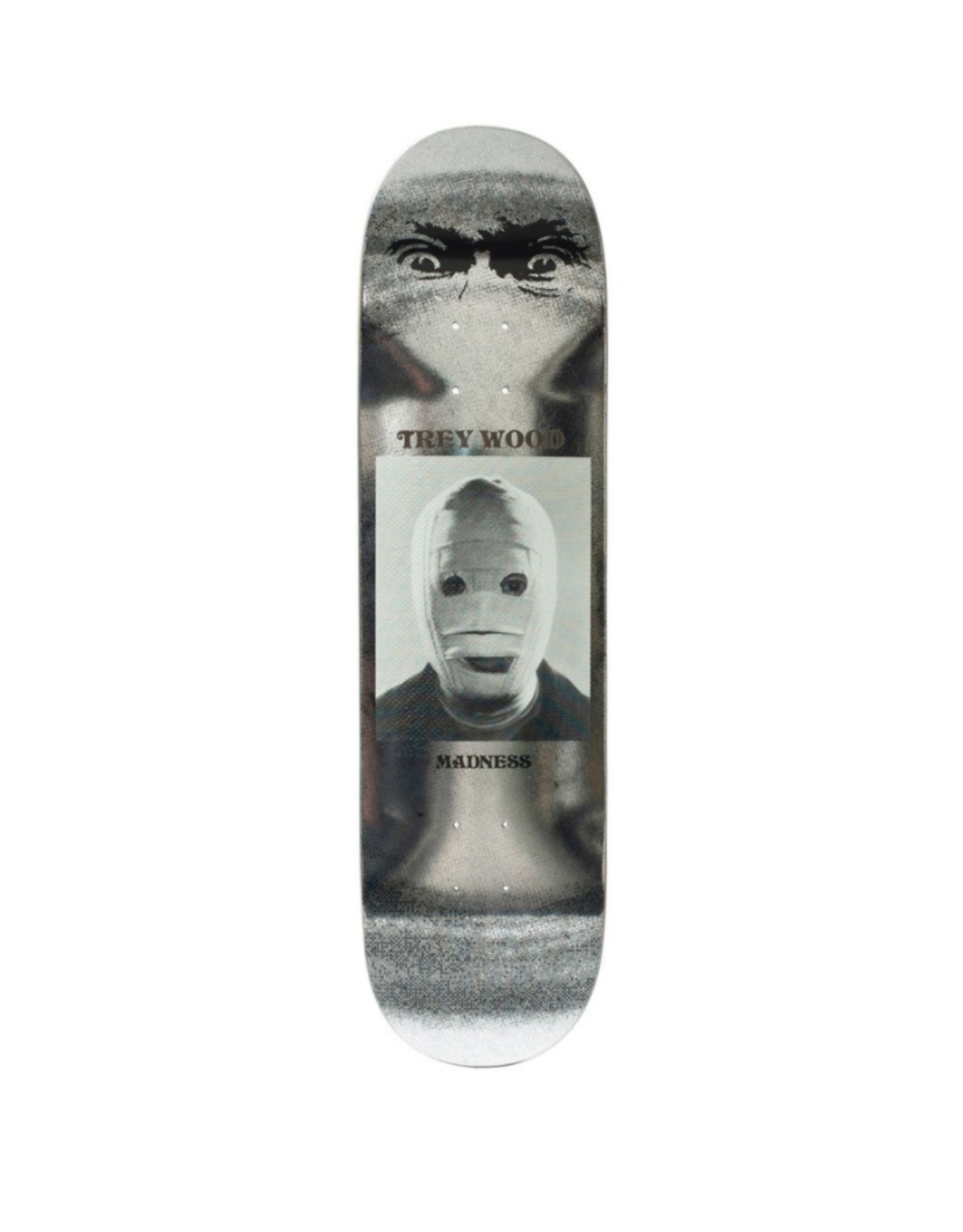 A skateboard with a graphic design featuring a face with a bandaged nose and mouth, and the word 'MAIDEN' written below it. The design is on a textured, speckled background with a gradient from light to dark. The skateboard is placed against a white background. | Madness Madness NEW PRO BANDAGE R7 DECK 8.25 | de651bd8e0b5703c6e7b7a29223c6ba1d43053b5fbed1e724069f2e0ecaeaaf9 | 001229710166 | 0 | 0 | 45 | 8 | 0 | 0 | |