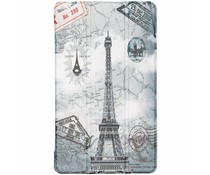 A vintage-style travel poster featuring the Eiffel Tower with a monochromatic color scheme. The poster includes various travel-related elements such as a map, a clock, a compass, and a series of stamps and postmarks. The Eiffel Tower is prominently displayed in the center, with a detailed illustration of the tower's structure. The background features a stylized map of the world with a focus on Europe, and the sky is depicted with a gradient from light to dark, suggesting a sunrise or sunset. The overall design has a nostalgic and artistic feel, reminiscent of classic travel posters from the early to mid-20th century. | Design Hardcase Bookcase Lenovo Tab E8 | 942719c1f9f58516d0557b4627ce32cbf52951618bfc89c939e49bf3d17708ba | 001229710101 | 0 | 0 | 102 | 6 | 0 | 0 | |