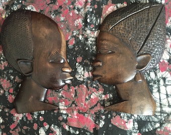 Two wooden African masks are displayed on a red and black floral background. | African Wall Carvings | 936f9f28f54bab307122f6a46900d271fa8a3e0d0ffedf42479bf1babe31e0c1 | 001229710019 | 0 | 0 | 13 | 3 | 0 | 0 | |