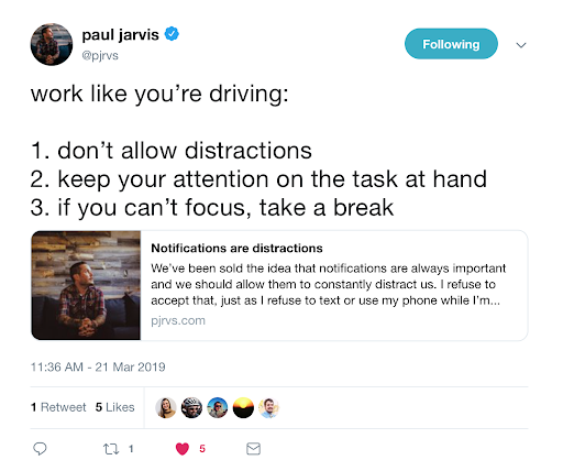 A social media post with a quote from Paul Jarvis, a well-known author and entrepreneur. The quote reads, "Work like you\'re driving. 1. Don\'t allow distractions. 2. Keep your attention on the task at hand. 3. If you can\'t focus, take a break." The post includes a photo of Paul Jarvis and a link to his website. There are also several likes and comments visible below the post. | this is a tweet from @pjrvs about single-tasking aka working on one thing at a time and taking a break when you lose focus | 9b8e76d7879b8fac829bc00a5b87ddfc51ccc22da8941265d1afcb12d62c3bb1 | 001229710617 | 0 | 0 | 68 | 24 | 0 | 0 | |