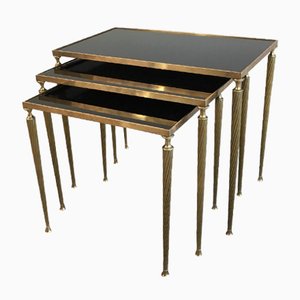 A sleek, modern coffee table with a black glass top and a brass frame is displayed against a white background. | Brass Nesting Tables, 1940s | 85ea753fc9d6e5bdeabdd494cb5df5cc07853bfa49a0f6d48850a05e5b6b2ec2 | 001229710561 | 0 | 0 | 20 | 4 | 0 | 0 | |
