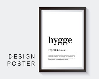 A framed poster with the word 'HYGGE' in large, bold, sans-serif font. The poster is set against a white background within a black frame. Below the poster, there is a text overlay that reads 'DESIGN POSTER' in a smaller, bold font. | Design Poster | HYGGE | Definition | Digital Print | Typo Image | Art print | Duden Phonetic | Coziness | Happy | a88bdf4b94383006609da2296eaab65412e844618d8917e456134f184d2b9b8a | 001229710642 | 0 | 0 | 41 | 22 | 0 | 0 | |