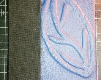 A close-up view of a leather book cover with a textured design featuring a central leaf motif. The cover is divided into two panels, with the left panel being a dark blue color and the right panel being a lighter blue. The book is placed on a cutting mat with a grid pattern, and there is a ruler partially visible on the left side of the image. | 1/2 Thick Hardcover leather journal Blue | 445cbd97742122c2a4419846302b6a50933a35d388b06d090d3aedc4013d41b8 | 001229710581 | 0 | 0 | 67 | 6 | 0 | 0 | |