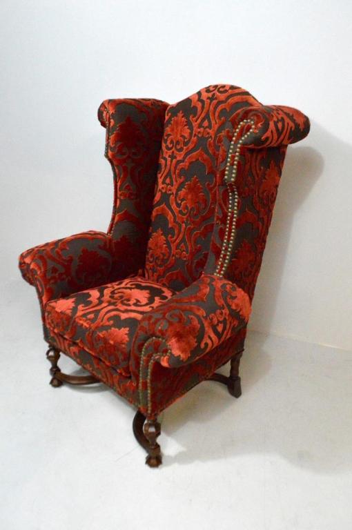 A red velvet armchair with ornate wooden legs and armrests is positioned against a white wall. | Monumental William and Mary Style Chair by Lee Jofa - 2 | a7a2fbf98116a80f0480e86715cef68c557ba3b12fd6b45810dd79f86691fb0d | 001229710684 | 0 | 0 | 16 | 11 | 0 | 0 | |
