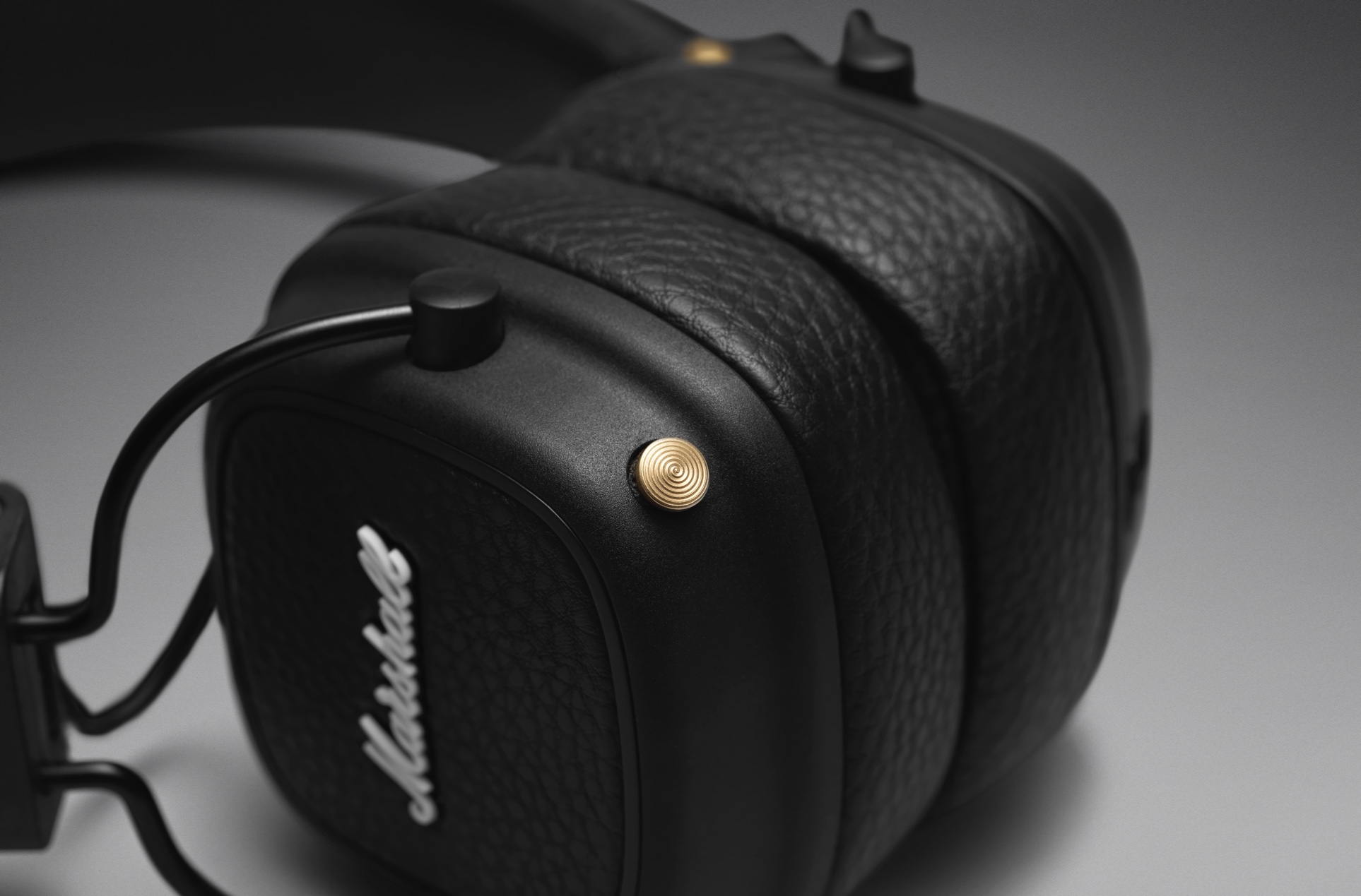 A pair of black leather headphones with a gold emblem on the earcup is displayed against a grey background. | Major III Bluetooth - Wireless Headphones | Marshall | ddc80072b4b410b411bf1dfb8ce138397b6dcb3a7c53432fe7b9207c3e531eb6 | 001229710431 | 0 | 0 | 19 | 8 | 0 | 0 | |