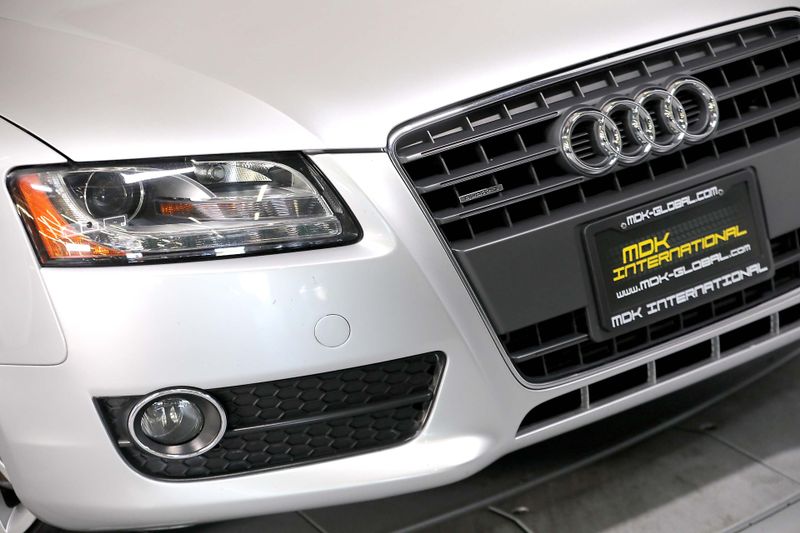 The first image shows the front of a white Audi car with a close-up view of the grille, headlights, and bumper. The car is parked on a tiled floor, and there is a license plate holder attached to the bumper with a black and yellow sticker that reads 'MONSTER GARAGE'. The sticker has a logo and the words 'MONSTER GARAGE' written in a stylized font. | 2012 Audi A5 20T Premium Plus - Navigation - Quattro AWD city California MDK International in Los Angeles, California | c371e5b662734a747c817b289dc9a072ac172a3c6a63bab1a967ab954b4d205e | 001229711414 | 0 | 0 | 65 | 19 | 0 | 0 | |